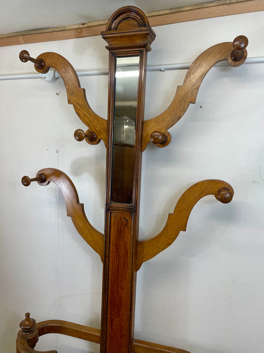 Antique Oak Coat Rack with Mirror – Restored Vintage Hall Stand